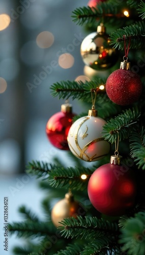 © ຈໍາປາ ຈໍາປາ, Fototapeta premium Ornament garland with nine glass and crystal balls, tree decor, holiday, winter wonderland