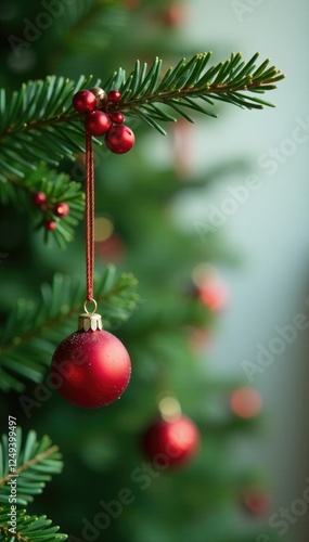 © chaiwat, Fototapeta premium Ornament hanging from a branch with mistletoe, natural elements, mistletoe, christmas tree branches