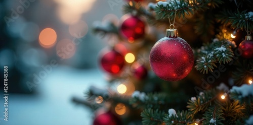 © LomaPari2021, Obraz premium Ornament-laden Christmas tree in soft focus with red glow, winter, bokeh, soft focus