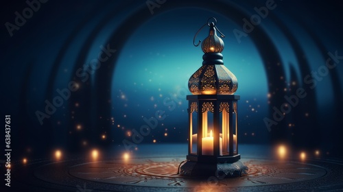 Fototapeta premium Ornamental Arabic lantern with burning candle glowing at night mosque...