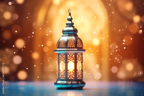 Fototapeta premium Ornamental Arabic lantern with burning candle glowing . Festive greeting card, invitation for Muslim holy month Ramadan Kareem. Ramadan Kareem greeting photo with serene mosque background