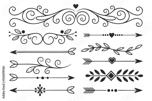 © sporsho, Fototapeta premium Ornamental Decorative Borders with Arrows and Floral Swirls in Hand-Drawn Black Vector. Elegant Dividers for Invitations, Posters, and Layout Projects.