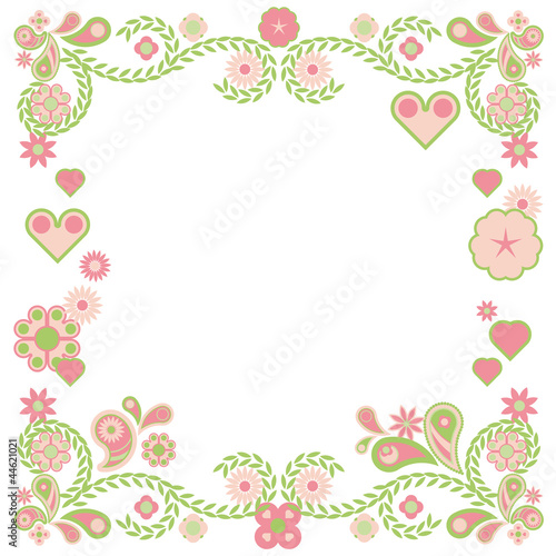 Fototapeta premium Ornamental frame with soft pink and green flowers and hearts
