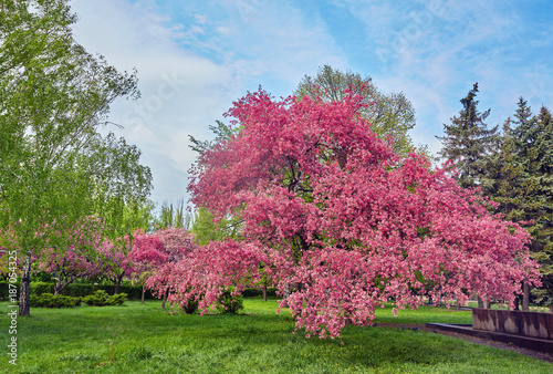 © Ryzhkov Oleksandr, Naklejka premium Ornamental garden with majestically blossoming large cherry trees