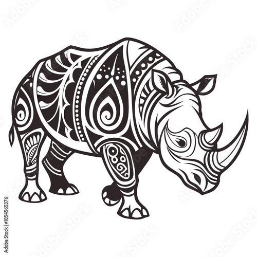 Fototapeta premium Ornamental rhinoceros vector illustration with intricate mandala patterns, black and white wildlife art.