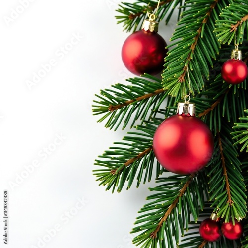 © Withun, Fototapeta premium Ornamented pine branch with red berries on white background, holiday decor, festive, winter wonderland