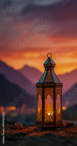 © FARZANA, Fototapeta premium Ornate antique lantern glows with warm light against a dramatic mountain sunset sky