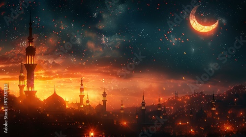 © AI Artworks, Fototapeta premium Ornate architecture illuminated by lanterns at night in Mosque,AI Generative.