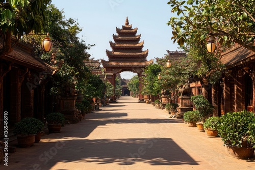 © Rex, Fototapeta premium Ornate architecture lines a cobblestone street, leading to an elaborate pagoda archway