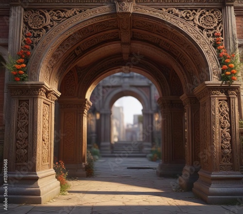 Naklejka premium Ornate archway with floral motifs and intricate carvings, ornate, motifs