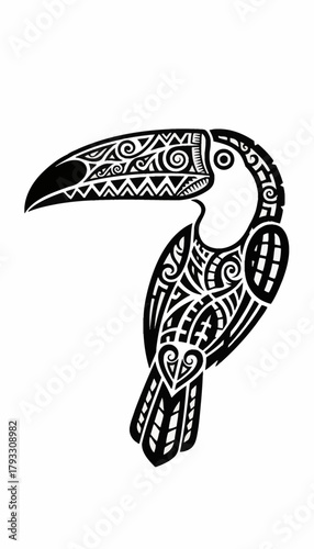 © black, Obraz premium Ornate black and white toucan illustration with tribal patterns.