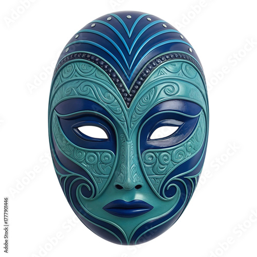 Naklejka premium Ornate Blue and Teal Tribal Mask with Intricate Swirl Patterns
