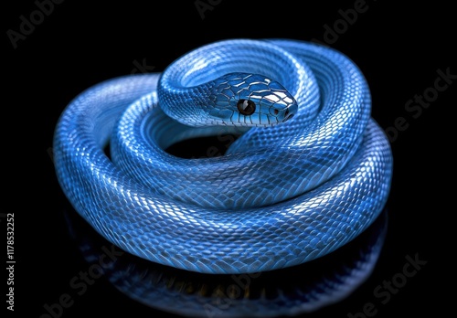 © ANUAR, Obraz premium Ornate Blue Snake Coiled Gracefully, Capturing Light with Iridescent Scales on a Black Background for Nature and Wildlife Photography
