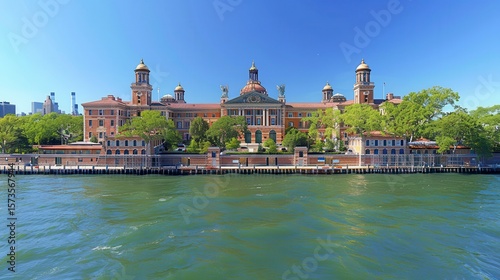 © NuriAlam, Fototapeta premium Ornate building with golden domes reflected in water under clear blue sky, green trees around