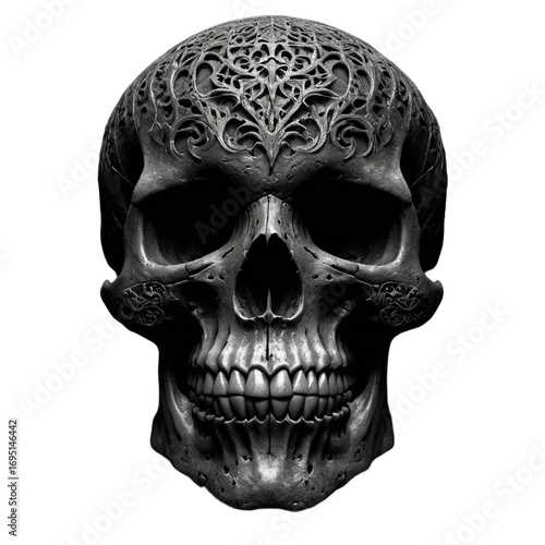 Fototapeta premium Ornate carved skull with intricate patterns isolated on transparent background