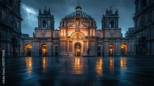 © Aashutosh Pandit, Fototapeta premium Ornate cathedral facade illuminated at night under dramatic sky
