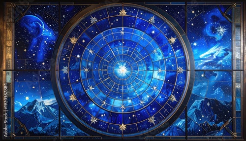 Obraz premium Ornate celestial stained glass window featuring zodiac constellations and a...