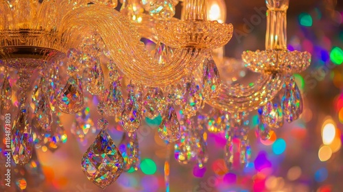 Naklejka premium Ornate chandelier, colorful crystals, sparkling lights.