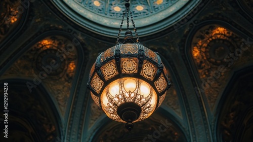 © NAIMAH, Obraz premium Ornate chandelier illuminates grand hall's ornate ceiling