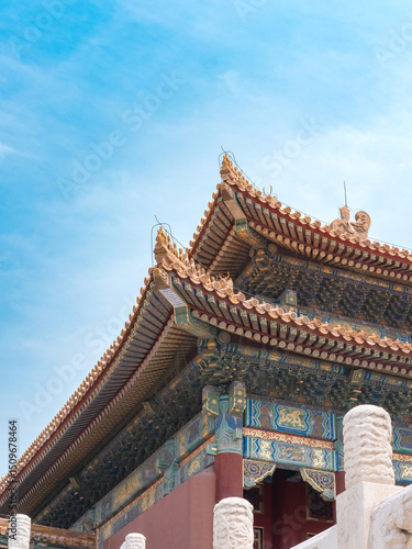 © Foto Mo, Fototapeta premium Ornate Chinese imperial palace roof with yellow glazed tiles and intricate painted dougong brackets. Detail of Forbidden City (Palace Museum), Beijing, China.