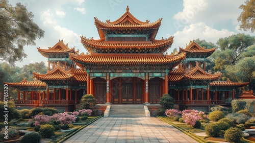 Fototapeta premium Ornate Chinese temple, serene garden setting.