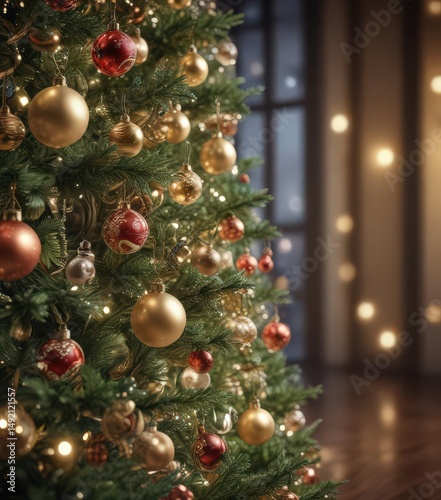 Fototapeta premium Ornate Christmas tree, shimmering baubles, bokeh lights, silver, merry...