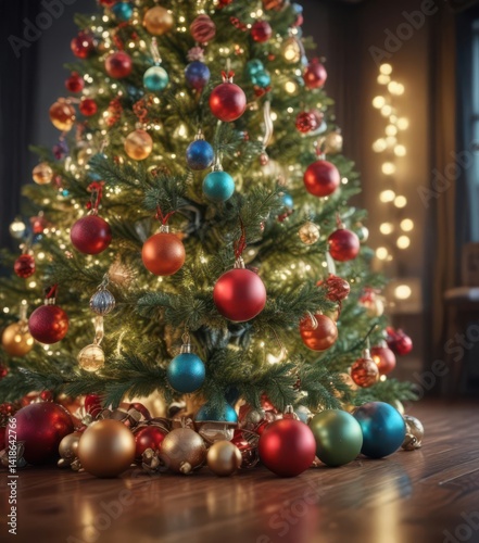 Fototapeta premium Ornate Christmas tree, vibrant baubles, soft bokeh lights , winter,...