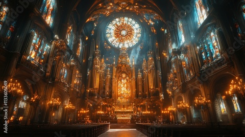 © Ali, Obraz premium Ornate church interior, glowing candles, stained glass.