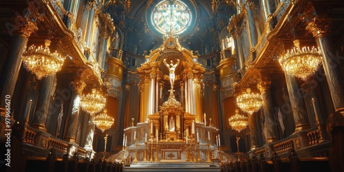 © novian, Obraz premium Ornate Church Interior with Golden Accents and Chandeliers