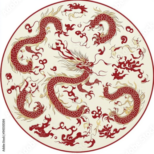 © Fragton, Fototapeta premium Ornate Circular Design Featuring Red Chinese Dragons and Clouds