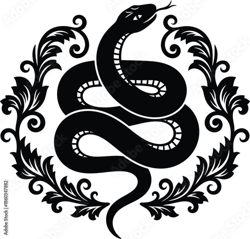 © Munna_SH, Obraz premium Ornate coiled snake silhouette with elegant floral scrollwork wreath and decorative leaf elements for creative vinyl cutting and artistic design.
