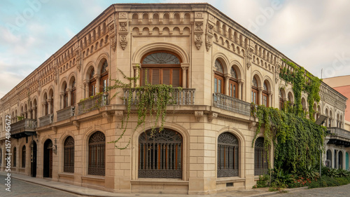 Fototapeta premium Ornate corner building with arched windows and lush greenery