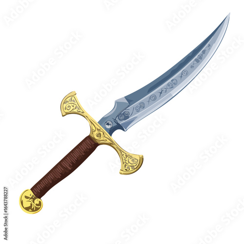 © Game, Obraz premium Ornate Curved Dagger with Gold Hilt and Brown Handle isolated on black background
