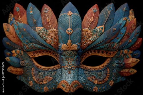 © Alexei, Naklejka premium Ornate decorative mask featuring vibrant colors and intricate feather designs, showcasing artistic craftsmanship and cultural significance in a visually striking presentation
