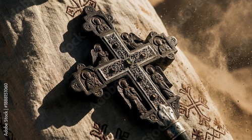 © misu, Fototapeta premium Ornate Eastern Orthodox Cross on Textile