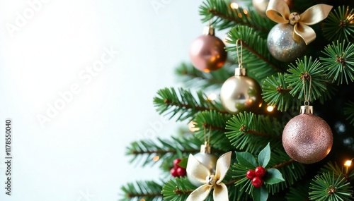 © Withun, Fototapeta premium Ornate evergreen branches with crystal ornaments and bows, holly sprigs, evergreen branch arrangement