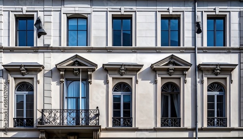 Obraz premium Ornate facade of a stately building with many arched and rectangular windows,...