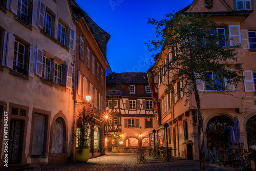 Obraz premium Ornate facades of the traditional half timbered houses in the Little Venice district in Colmar, picturesque village in Alsace France at sunset