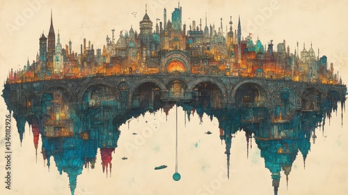 Obraz premium Ornate fantasy city spans above and below a central bridge