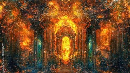 © Кирилл Макаров, Obraz premium Ornate fantasy doorway with intricate glowing details in a magical setting. Vibrant colors and rich textures create a mystical atmosphere. Generative by AI