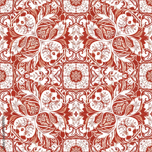 © Aswinah, Fototapeta premium Ornate floral pattern with symmetrical design in shades of red and white, patern seamless, royalty stock.