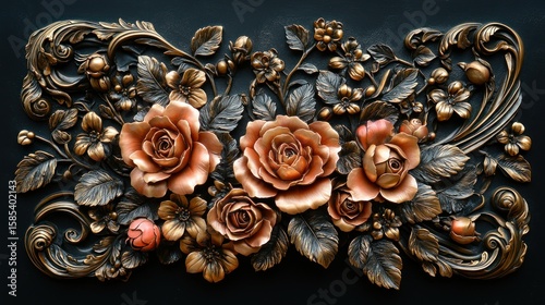 © BloomArt, Obraz premium Ornate floral relief sculpture on a dark background.