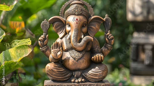 © Bos Amico, Fototapeta premium Ornate Ganesha Statue Guarding Home Entrance with Lush Greenery