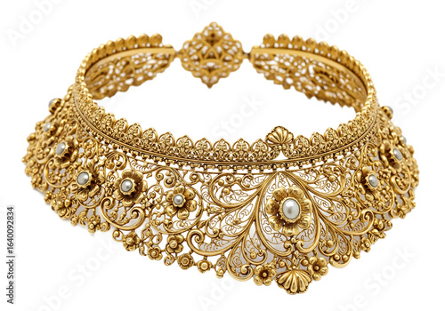 © Emu301, Obraz premium Ornate gold choker necklace with intricate floral patterns and pearls isolated on a transparent background