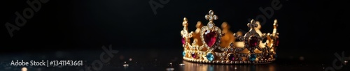Fototapeta premium Ornate gold crown, glittering gemstones, black backdrop, header, retro