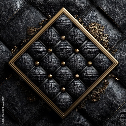 Fototapeta premium Ornate Gold Frame on Black Tufted Leather Texture quilted