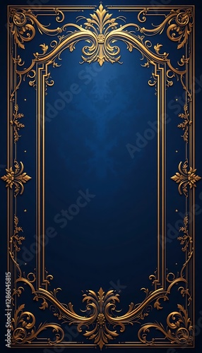 © anomalicreatype, Obraz premium Ornate Gold Frame on Deep Blue Background with Empty Central Space