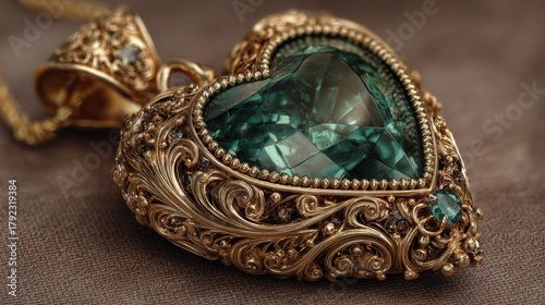 Obraz premium Ornate gold heart pendant featuring a green gemstone resting on a stone surface