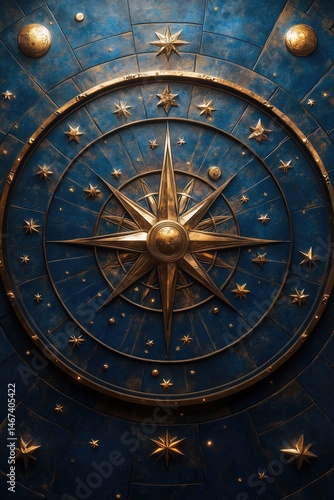 © Anna, Fototapeta premium Ornate gold star compass on blue celestial-themed background