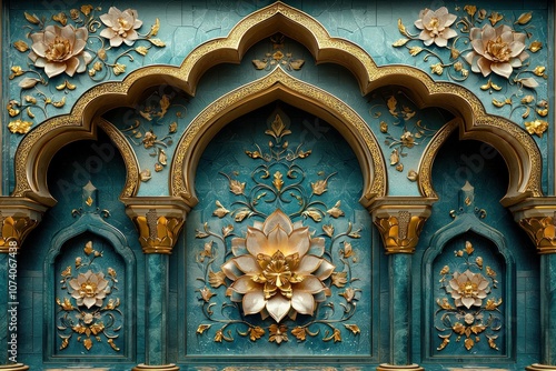 © upnowgraphics, Obraz premium Ornate Golden Floral Design on Teal Wall with Arches